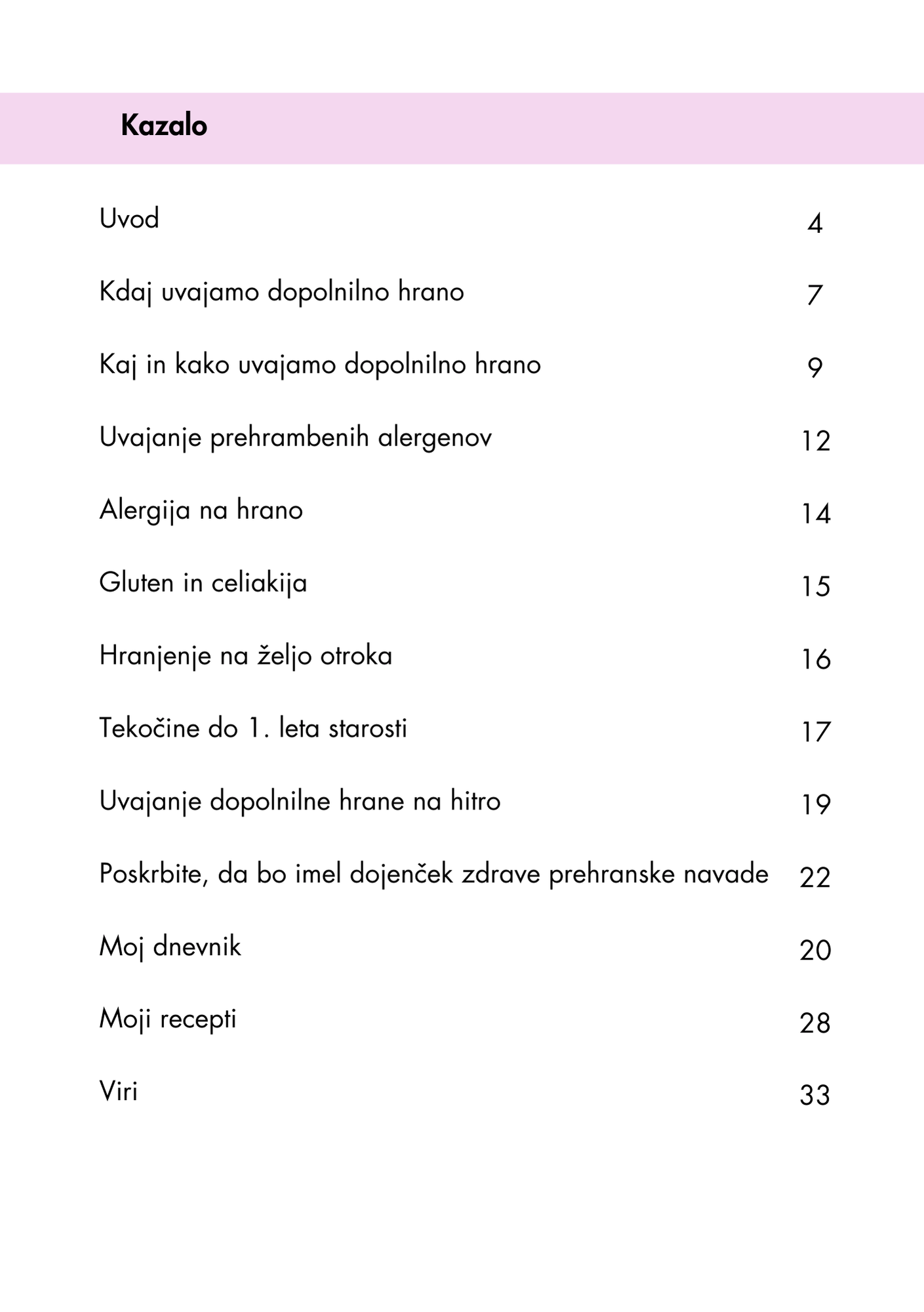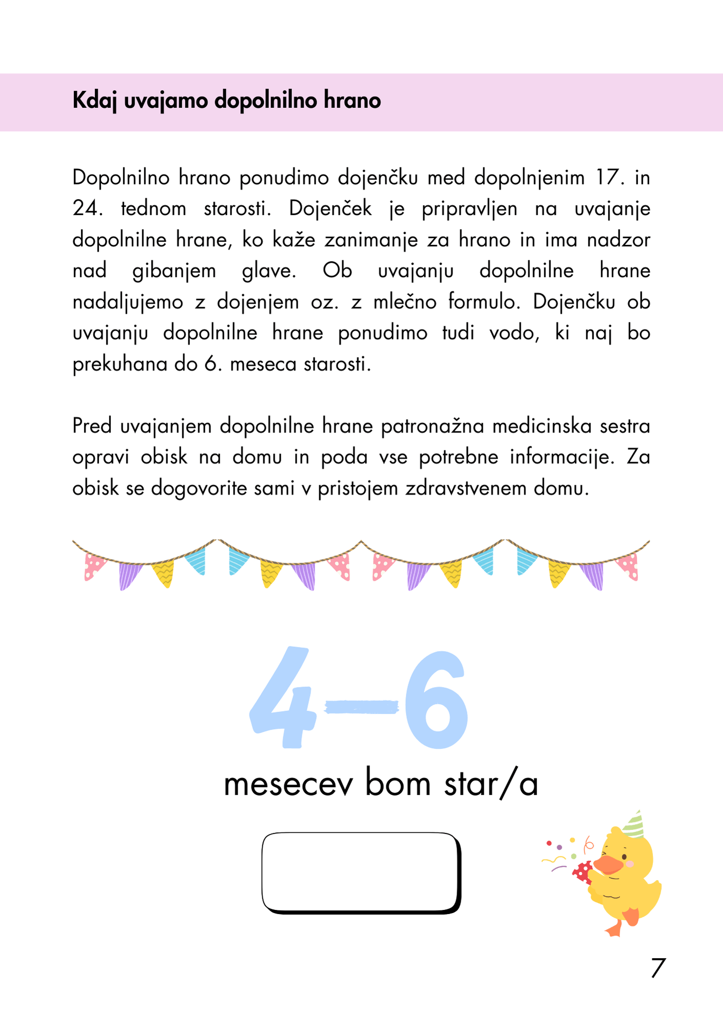 E-knjižica Uvajanje dopolnilne hrane je praktičen vodnik za starše in skrbnike, ki se soočajo z novim, a pomembnim korakom v razvoju dojenčka – prehodom izključno mlečne prehrane na trdno hrano. Na jasen, razumljiv in strokovno podprt način ponuja odgovore na najpogostejša vprašanja, predstavi priporočila glede primernega časa za začetek, vrst živil in postopnega uvajanja, obenem pa poudarja pomen poslušanja otrokovih potreb in ritma. Namen knjižice je staršem vliti samozavest in jih opremiti z znanjem za zdravo, varno in prijetno prehransko izkušnjo njihovega malčka.